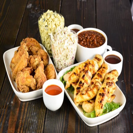Feeds 5-6 people with our jumbo fingers and wings party packs!